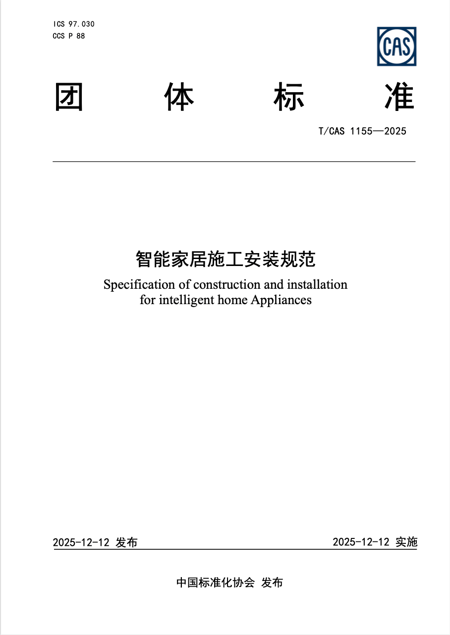 《智能家居施工安装规范》T/CAS 1155-2025团体标准旨在规定智能家居施工安装的基本要求、施工流程、技术规范、验收标准及安全环保要求。适用于家庭、酒店、办公场所等场景的智能家居系统施工安装活动,涵盖需求沟通、图纸设计、水电交底、设备安装、网络配置、系统集成、调试验收等环节。