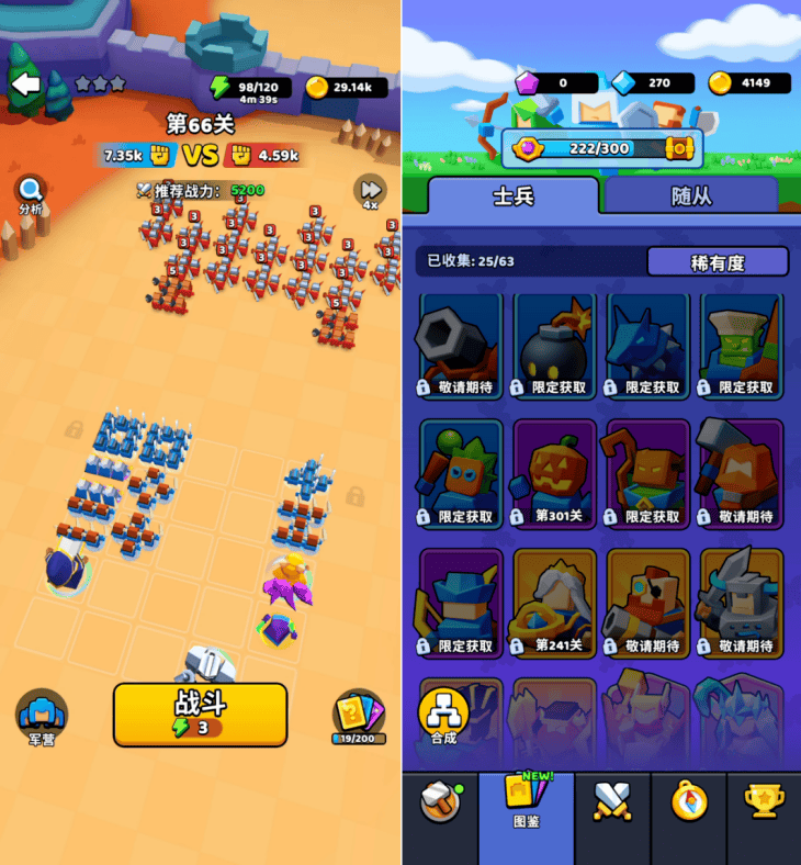 如今的《War Inc:Rising》则放弃了空间管理元素,采用常见的二合+策略的核心玩法设计,玩家“闯关——获取金币——召唤及合成”的形式进行。其实,初期体验《War Inc:Rising》时,称其平平无奇并不为过。但是,当玩家解锁所有玩法功能之后,会发现《War Inc:Rising》其实在用独特的方式设计游戏。深入体验后会发现,《War Inc: Rising》的核心矛盾在于:它的长线设计颇具心思,但前期体验却充满了“劝退”感