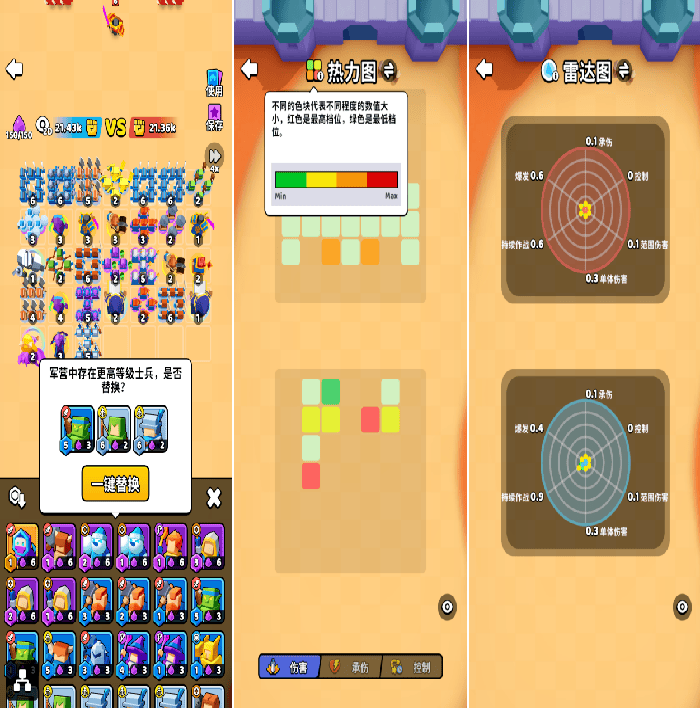 首先是关卡与上阵机制。随着玩家主线推进越深入,遭遇的士兵种类越高级、士兵等级也越高级,在圣水机制作用下,玩家只能选择部分单位上阵。除此之外,游戏对战前,局内拥有克制提示、伤害系数展示等等,但未能清晰传递出作用及相关位置显示所在,从而驱动玩家构建差异化。另外,包括士兵之间的攻击具有克制关系,但实际并未呈现有效效果,以及引导玩家对这些系统的理解。