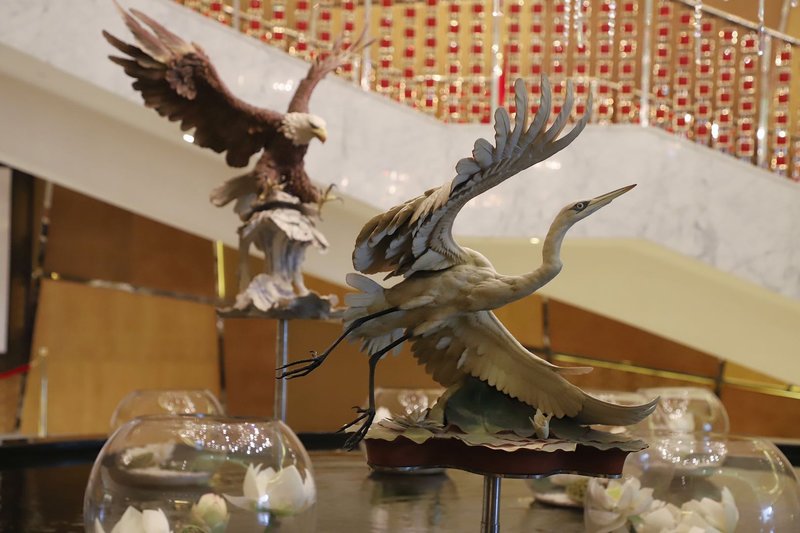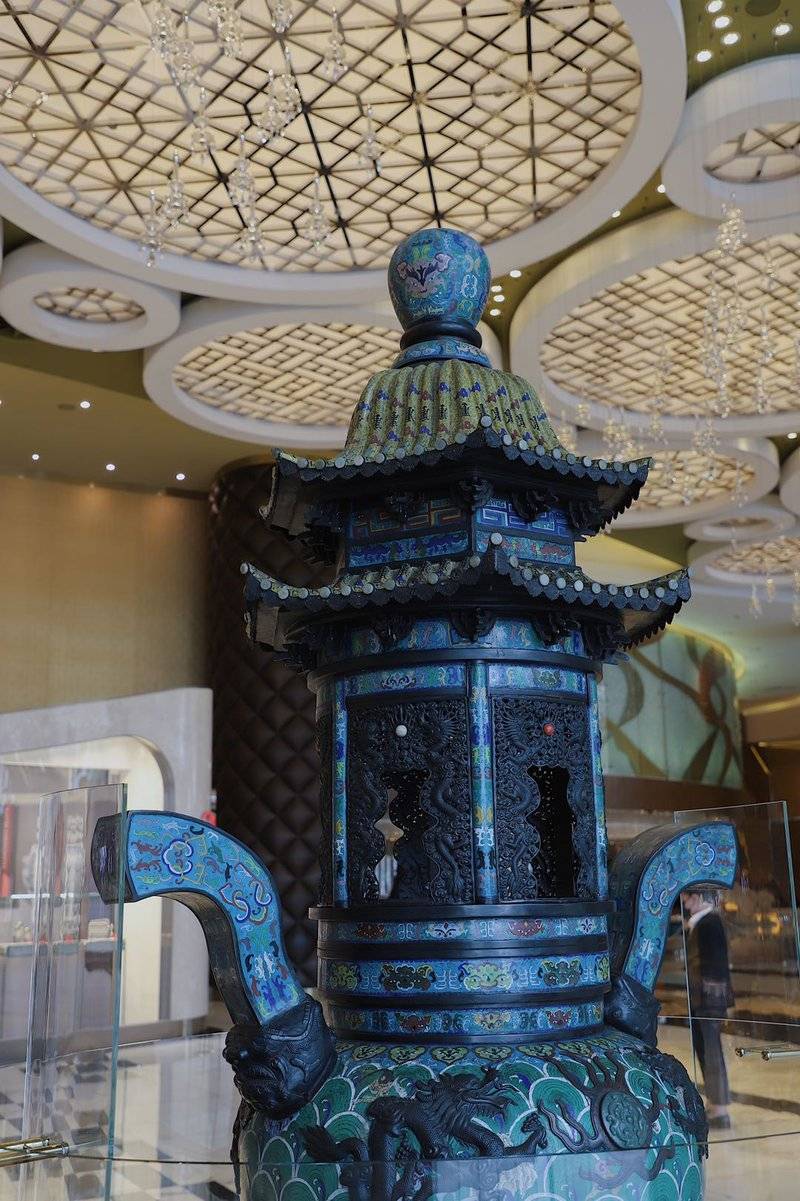 步入大堂,大片的水晶吊灯及艺术品在这里陈列、展示,感觉自己似乎走进了一座艺术博物馆一般。细节打量了一番这两颗处在门口C位的宝石,一颗名为“何鸿燊之星”,形像枕头寓意“安枕无忧”;另一颗为祖母绿宝石,寓意“凝聚缥缈时空的力量”。