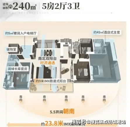 建面240㎡五房两厅三卫作为项目的压轴户型,仅28套实景呈现,堪称“楼王级”产品。一梯一户的配置,让业主拥有约9㎡奢阔入户电梯厅,私密性与尊崇感拉满。9米南向露台级阳台,是这个户型的点睛之笔,业主可以在这里打造自己的空中花园,喝茶聊天、养花种草,享受惬意的生活时光。户户三面观景,能够直览白云山与城市中轴景观,景观视野堪称一绝。这个户型适合高端改善家庭,能够充分满足业主对品质生活的极致追求。