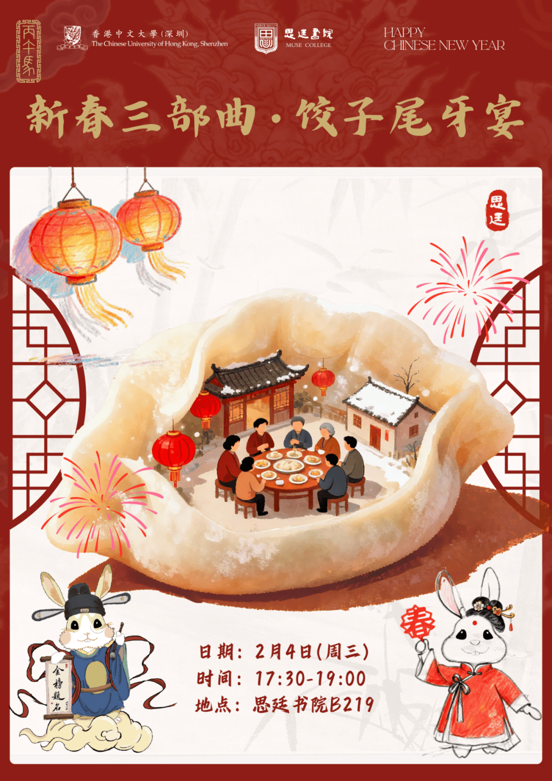 祥波书院C栋舍监蔡雨薇女士与全人成长导师宗心怡老师,邀请祥波师生于2026年2月13日12:00-13:30在祥波书院小广场共赴一场暖心盆菜之约。围坐一堂,品尝地道岭南风味,在满盆珍味的鲜香里,感受 “盆满钵满、团圆美满” 的新春期许。