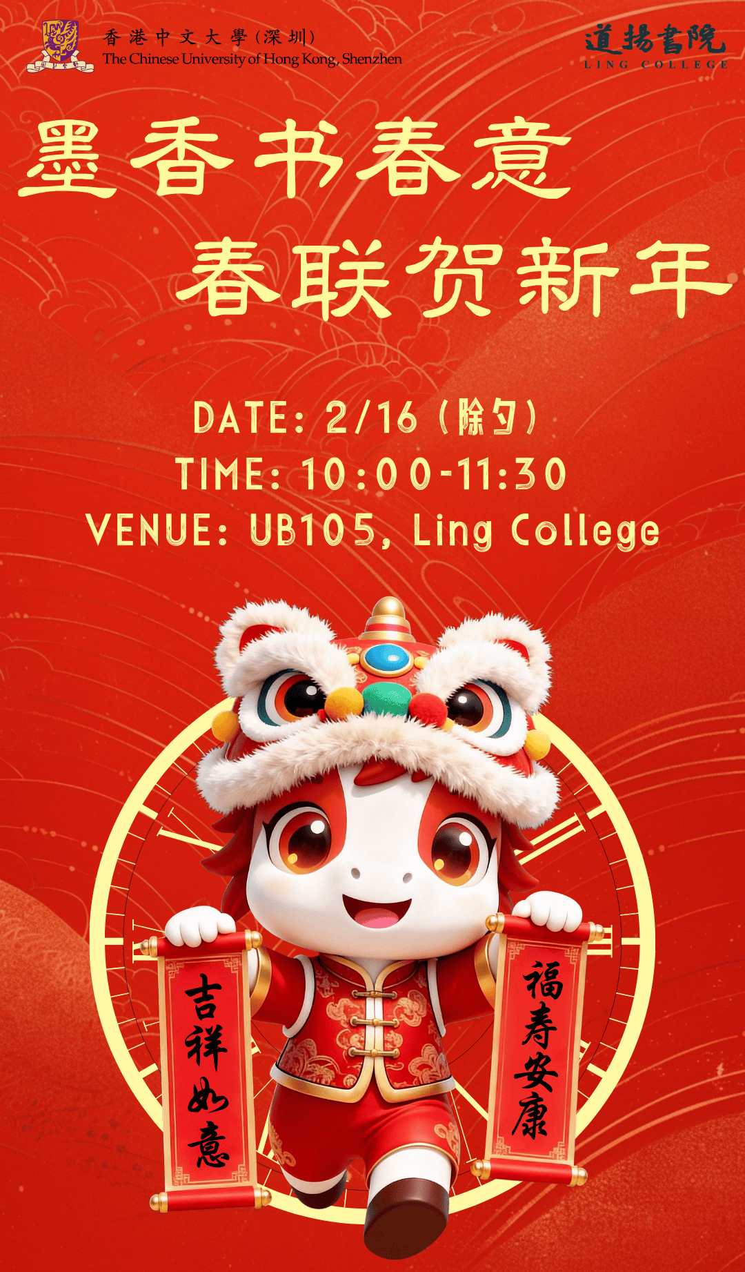 新年将至,你贴对联了吗?作为过年必不可少的文化符号,对联承载着我们对岁序更新的美好期许。在2026年2月16日10:00-11:30,道扬书院邀请全校师生们齐聚UB105,用笔墨为马年迎新蓄势。无论你是书法达人还是创意达人,快来用这一抹中国红,在马年伊始书写属于你的“一马当先”!